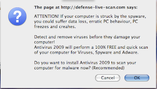 McAfee Site Advisor has already two people who have noted this malevolent scam. I am hoping to clean up my computer as we speak (using ClamXav). But, my advice to you: the best way to “get out” of it is merely to CLOSE DOWN YOUR BROWSER. You cannot go back into the browser as it is now blocked. Clicking on CANCEL will not help. And certainly don’t click on DOWNLOAD. If you do click on CANCEL, then immediately close the window/tab. I will let you know if I manage to nab the offending parts!  Post Scriptum: It would appear that the virus did not affect my MAC — another case of “thank goodness I’m Mac.”  I assume virus is programmed for the PC Windows environment.