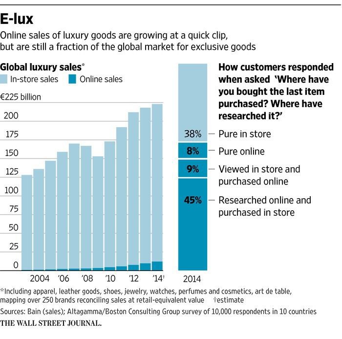 Among the major luxury brands to refrain from giving their customers what they want digitally (i.e. eCommerce) have been Fendi, Chanel and Celine. Fendi (LVMH) only recently acquiesced and opened up its eCommerce site in March 2015. Chanel just announced that it will open up this new channel by the end of next year. Clearly, they are in no hurry. What has been a strategic absence may turn into a strategic error in that the learning curve will remain long and steep against a competition that has been living and learning the ropes for several years. Various pundits place the eCommerce potential for luxury brands at 10-20% of total sales versus the current estimated 8%, according to this composite graph below via the Wall Street Journal (Bain and Altagamma/BCG).