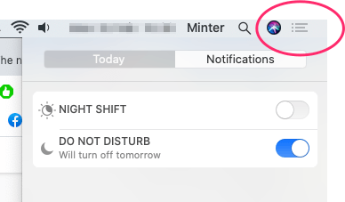 2. Become fully familiar with how to mute your notifications on your mobile, tablet and computers. At a very minimum, I advise to turn the sound off ALL notifications. I suggest even eliminating the vast majority of the badge notifications (the little red circle that states the number of messages within). When you are doing a presentation or are online and will be speaking, the best suggestion is to find the way to find the DO NOT DISTURB setting on your desktop and/or mobile. (E.g. See the top right hand 3 dots & 3 lines sign at top right of your mac, as pictured below). If you plan to keep notifications, be hyper selective. Be careful to review regularly as sometimes, through updates, an app will impishly put notifications back on by default.