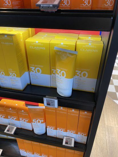 The uses of a QR code on shelf labels could at least make the pricing and offer clearer. For example, in the case of the Relay counter at CDG airport (Paris), a QR code could show on the phone exactly what goes into the “menu” offering, what are the ingredients, calorie & carbohydrate counts, etc. On the right, considering Clarins is a high-end brand, it’s appalling to see such hard-to-read labels, filled with so much text that’s basically impossible to make out without getting out one’s glasses and bending over. Retailers are going to have to get much more clued in on the customer experience if they want to get more sales, much less happier customers.
