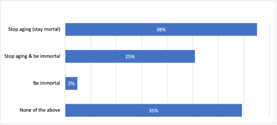 The answer from 122 respondents, shows that, like Odysseus, a little over 1/3 (35%) are not in favour of this anti-aging, immortality kick (none of the above). Meanwhile, 38% said that they would seek to stop aging, while staying mortal. One quarter would like to stop aging and be immortal. If a total of 27% are in favour of their own immortality, it stands to reason that nearly 3 out of 4 are ok with their mortality.