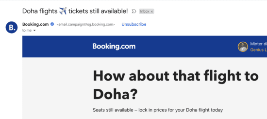 It’s been about three weeks since I managed to book all my trip via Expedia. In the intervening time, Booking has sent me a number of marketing messages, trying to encourage me to book my flights (see below) and/or to book hotels at the destinations that were on my itinerary.