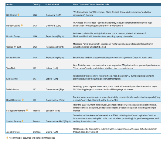 All told, across these four countries’ left‑handed leaders, you end up with roughly twice as many right‑leaning as left‑leaning. That’s politically ironic: in a world where “left” is supposed to symbolise progress, rebellion, and change, the literal left‑handers in power have often been the ones defending markets, hierarchy, and tradition. In the fluid ideological landscape since the 2000s—where “right” parties borrow social‑liberal ideas (for example: in the US, Trump broke with the right-wing orthodoxy of free trade) and “left” parties endorse market‑friendly reforms (for example: Clinton championed NAFTA, deregulation and endorsed pro-market free trade)—the symbolism becomes even more delightfully scrambled. [See the “Political Scramblings” table at the end this post for how left and right have become scrambled in each country.]